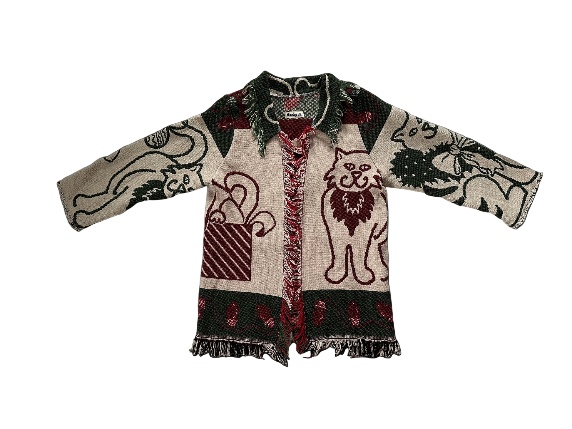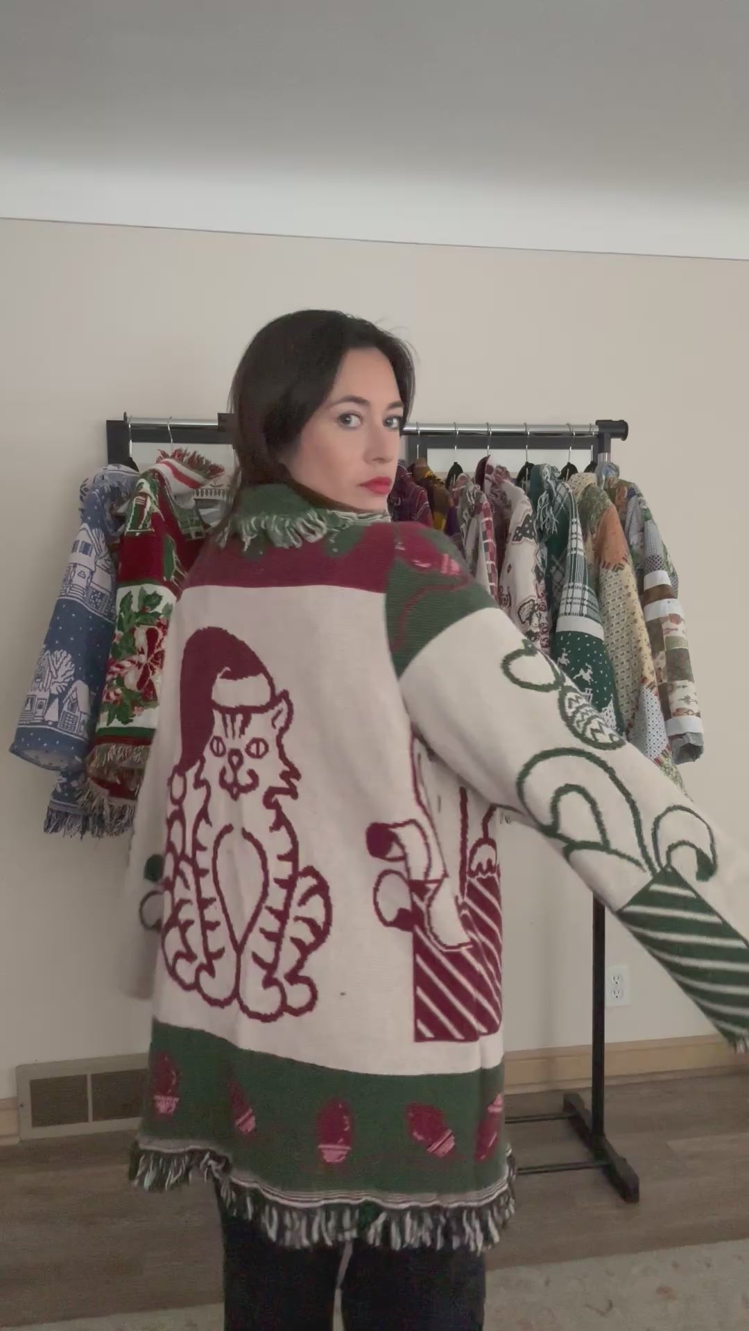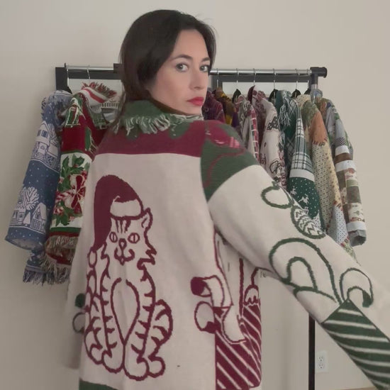 This one-of-a-kind blanket sweater is woven with playful holiday cats, quirky ornaments, and rich winter tones—perfect for anyone who loves a little whimsy with their warmth.