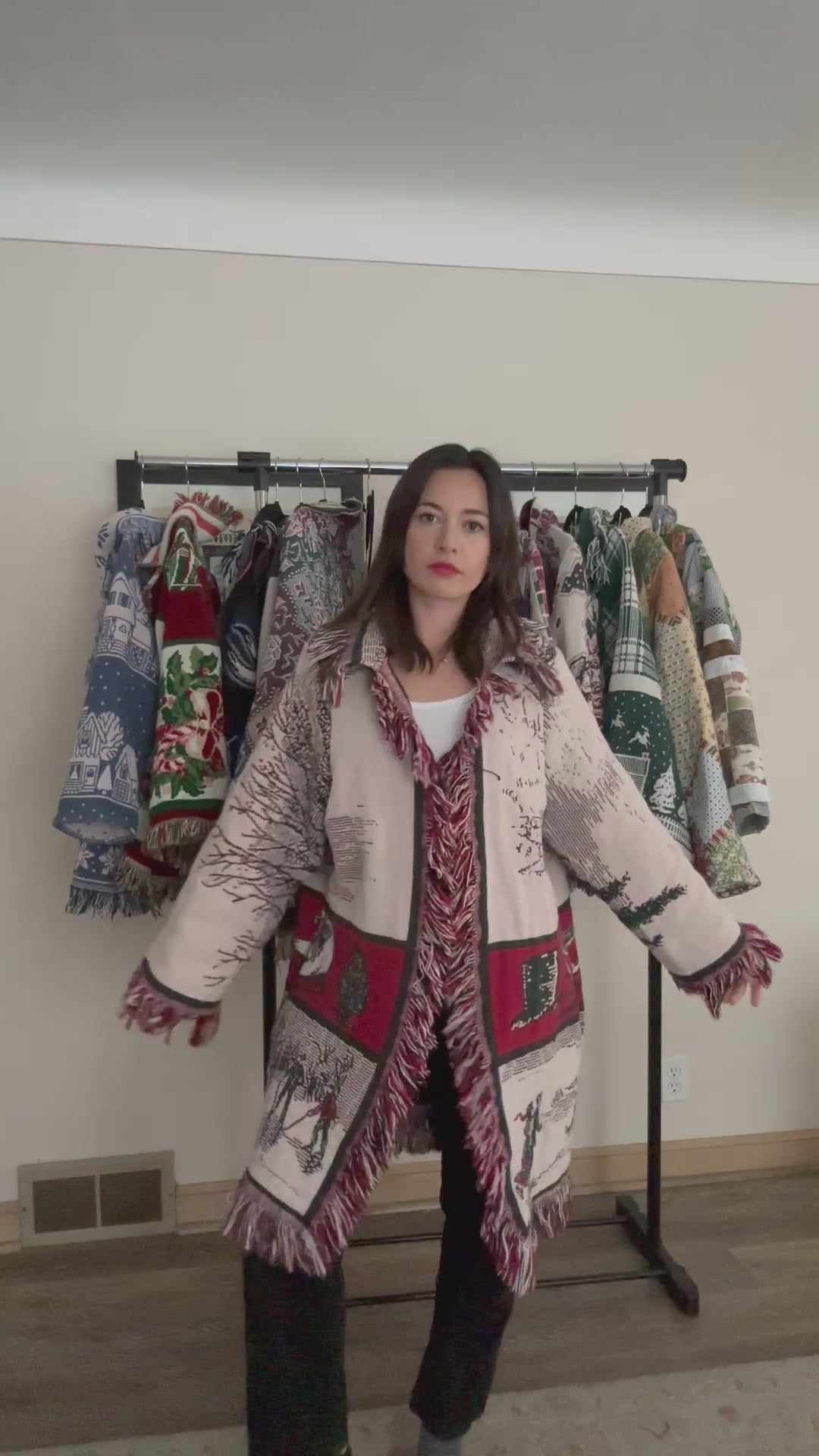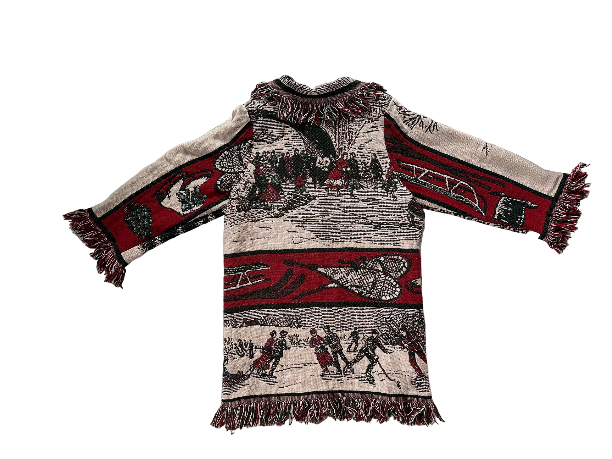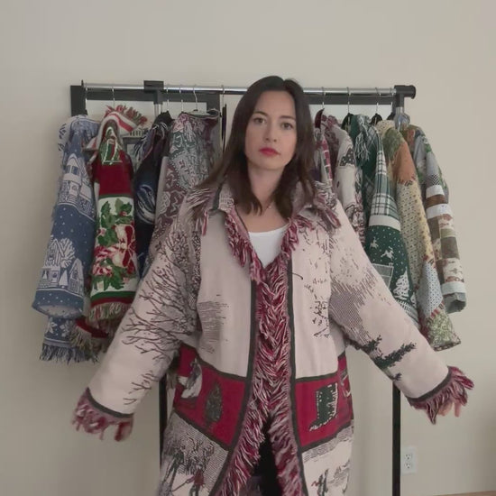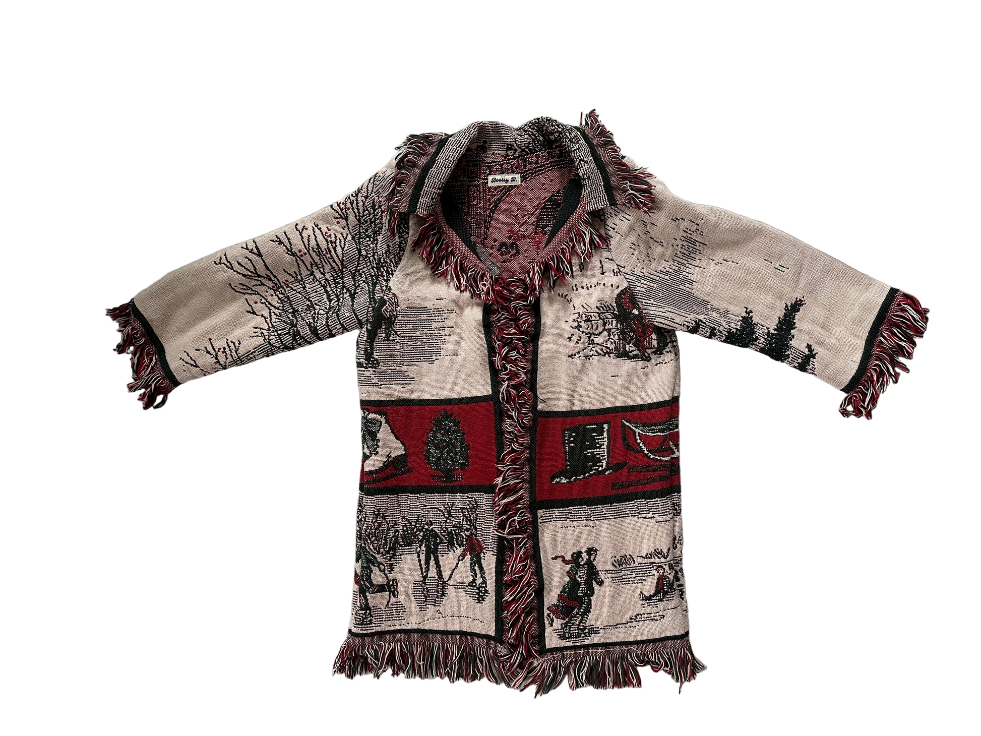 Say hello to Noelle, a nostalgic winter wonderland wrapped into a one-of-a-kind blanket sweater. Made from a vintage Goodwin Weavers woven throw, Noelle features classic holiday scenes—ice skaters, snowy trees, tiny cabins, and festive touches that feel straight out of an old-fashioned Christmas card.
