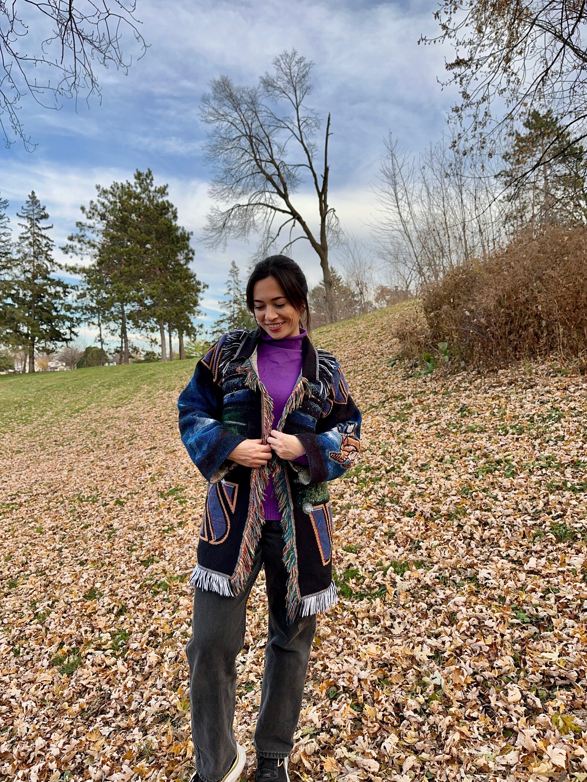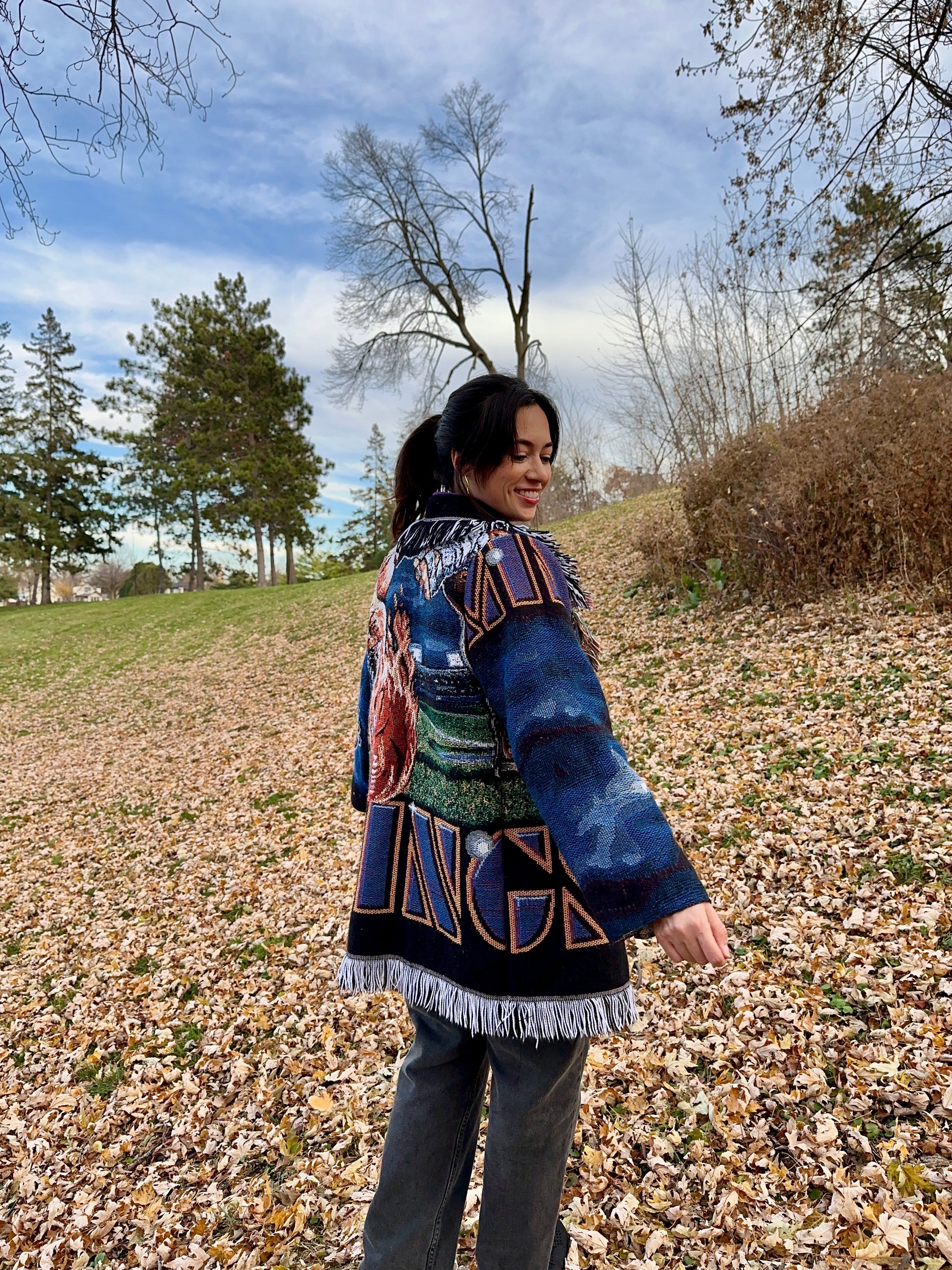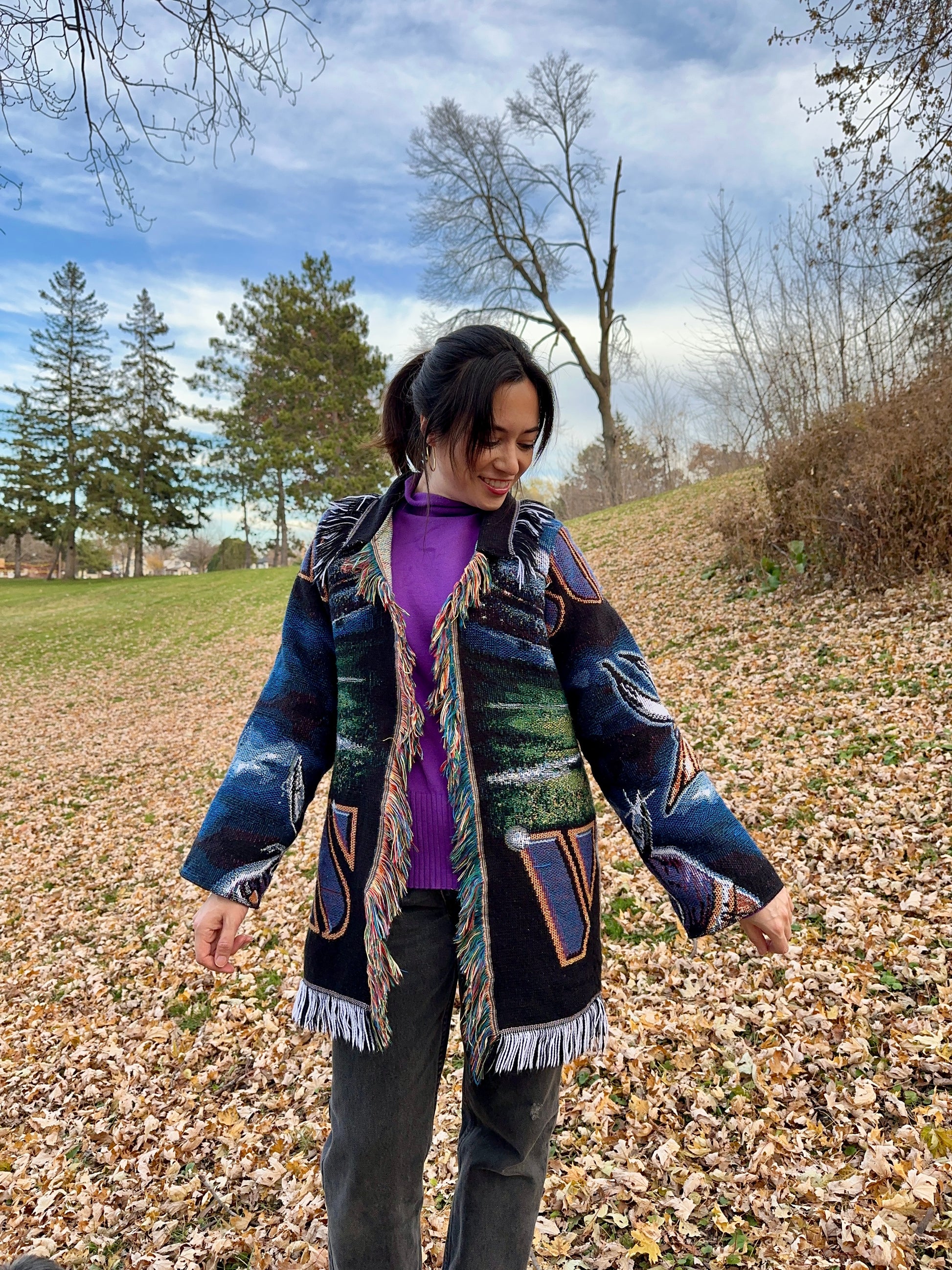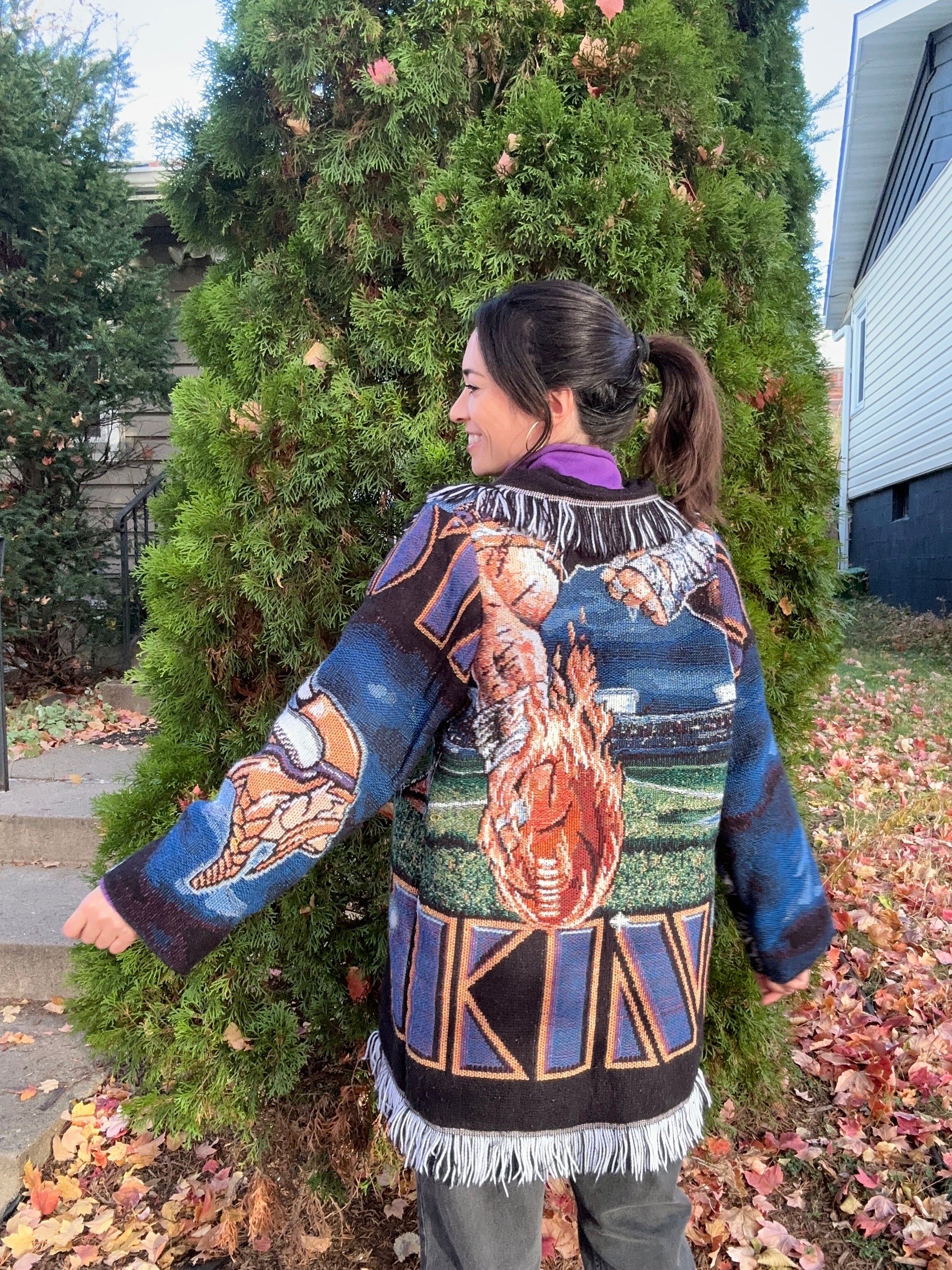 Exclusive upcycled handmade sweater, crafted from a vintage woven blanket that proudly showcases your Minnesota Vikings spirit. This unique piece features the team's iconic purple and gold colors, while the vibrant, confetti-like fringe adds a playful touch that makes it perfect for game day celebrations.